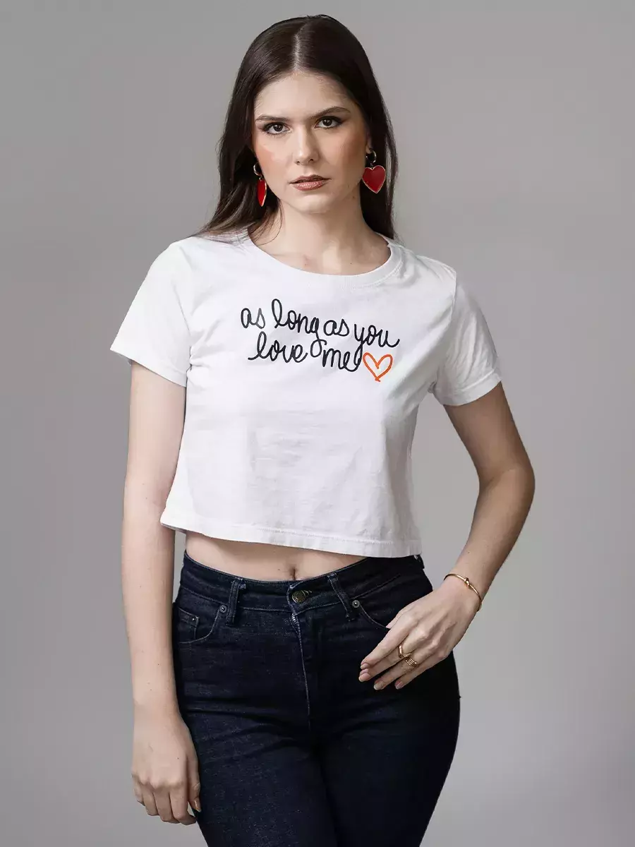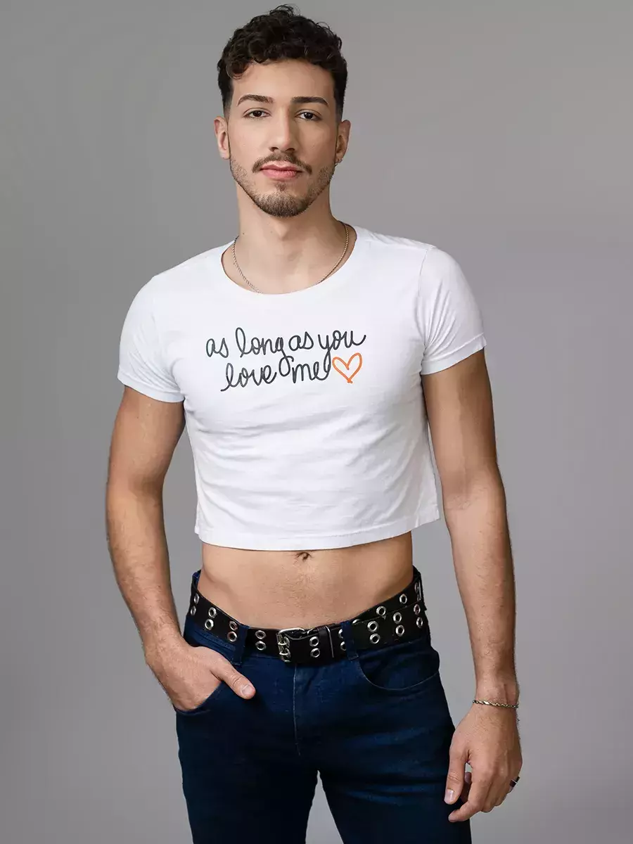 Esse cropped é uma homenagem aos Backstreet Boys e ao romantismo audacioso de “As Long As You Love Me”. Com shape clean e mensagem que pulsa, a peça celebra aquele sentimento à prova de tudo — o amor que toca fundo, mas sempre com uma pitada de atitude. No centro, o lettering cursivo ganha vida em preto, como se tivesse saído direto de um diário secreto de fã. Abaixo, um coração vermelho em relevo arremata o design: não é só estampa, é convite tátil para sentir cada batida da música.