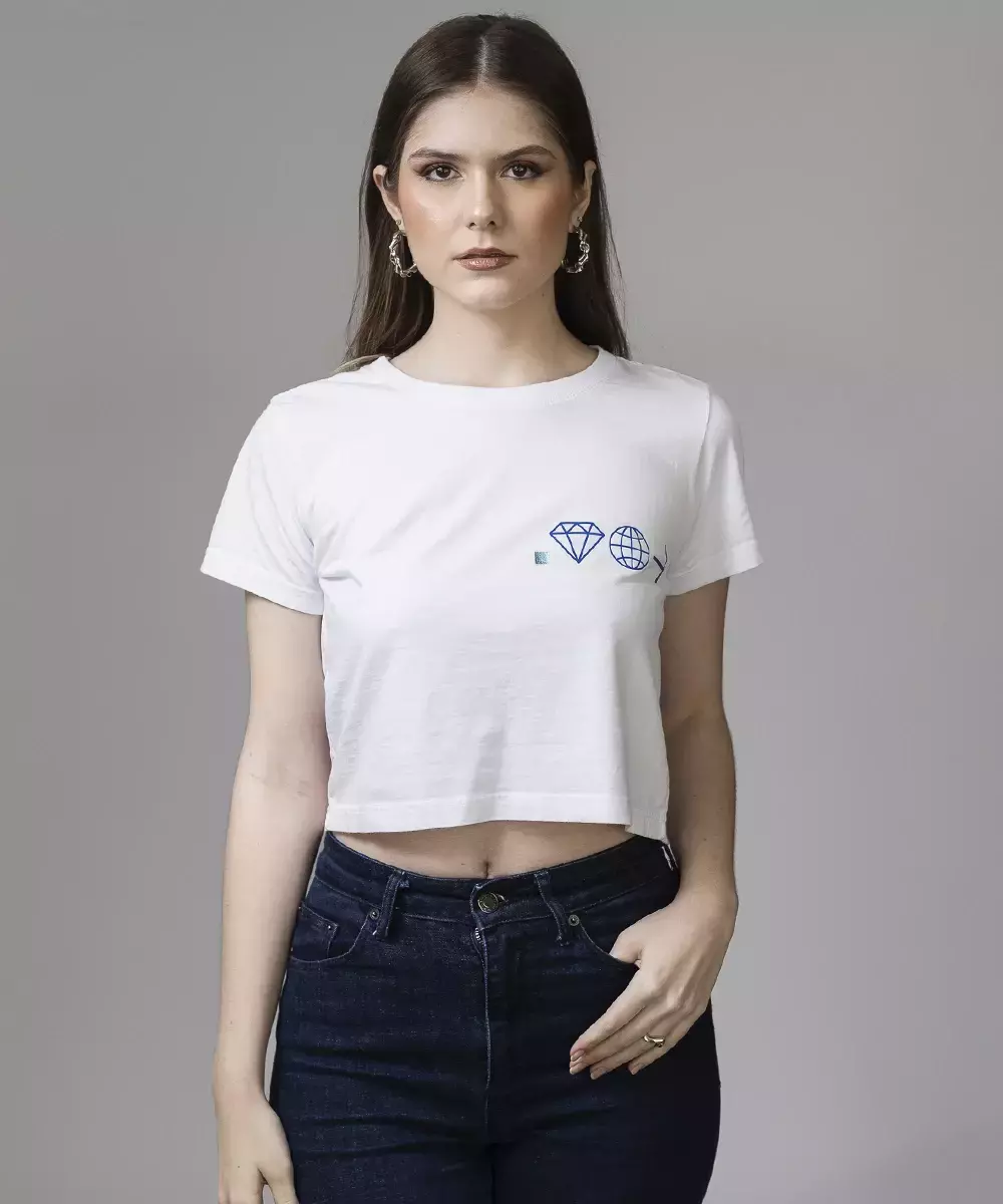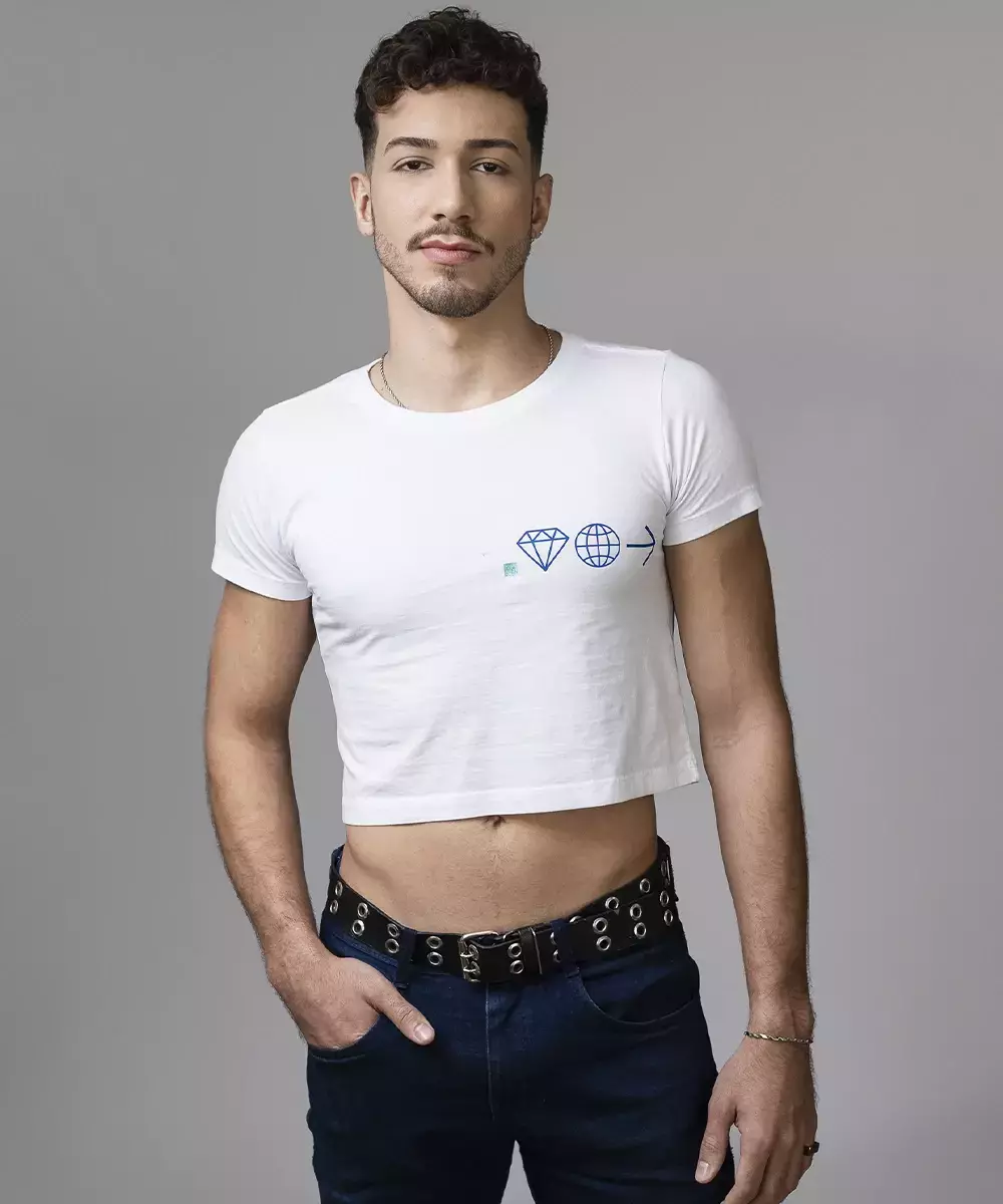 Essa cropped tee é puro charme pop, inspirada na diva australiana Kylie Minogue e sua capacidade única de transformar cada verso em espetáculo. Com design minimalista e mensagem máxima, a peça foi feita para quem ama os detalhes — e entende as referências. Na frente, uma estampa pequena com os símbolos visuais da atual turnê da Kylie: o ponto (em holográfico), o diamante, o globo e a seta — signos que, juntos, resumem a vibe dela: energia eletropop, dançante e cheia de intenção. O ponto holográfico é o detalhe que entrega: ali tem brilho, mas só pra quem prestar atenção.
