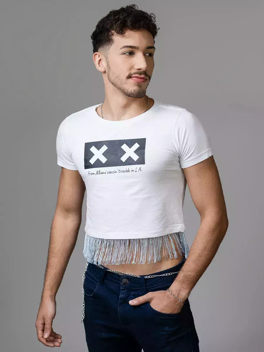 Esse cropped traz a essência explosiva e teatral da nova era de Camila Cabello — provocativa, visual, urbana e deliciosamente caótica. Na frente, o destaque visual: um retângulo preto com dois X brancos, igual a faixa usada nos olhos da cantora nos clipes e visuais promocionais do álbum C,XOXO. O símbolo vai além do visual: representa anonimato, mistério e provocação. Abaixo, a frase “from Miami causin’ trouble in L.A.”, tirada direto da sua música, que resume toda a dualidade cultural da artista: entre o calor latino das raízes e o caos glamouroso da cena pop norte-americana. Na barra, o movimento entra em cena com franjas azuis, que acompanham seus passos como um efeito colateral da sua presença. Um detalhe que flerta com o ritmo e deixa claro: essa roupa foi feita para dançar, se expressar, viver intensamente.