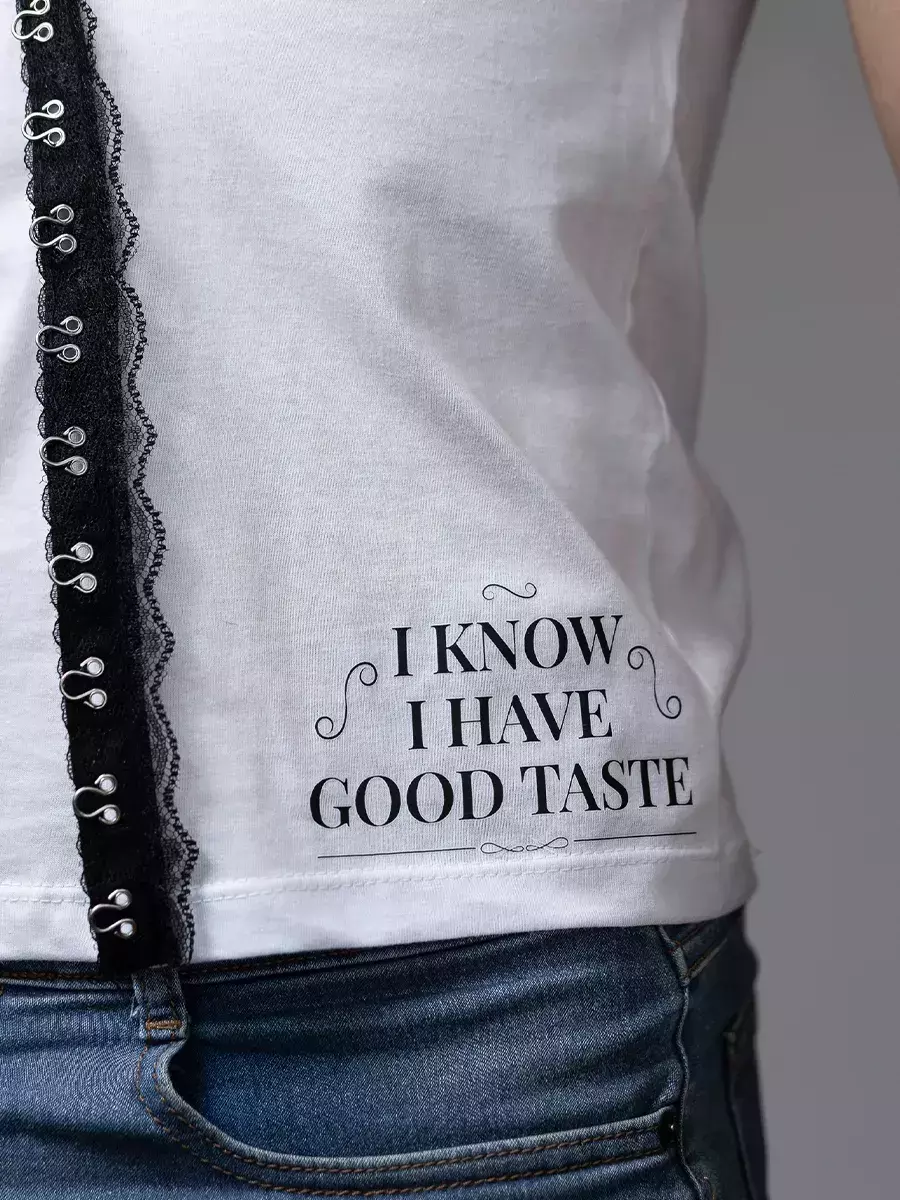 Na lateral, a frase estampada em detalhe: “I know I have good taste”, direto da letra que virou hino de autoestima afiada. Enquanto nas costas, o detalhe do beijo vermelho em relevo no ombro fecha o look com charme.